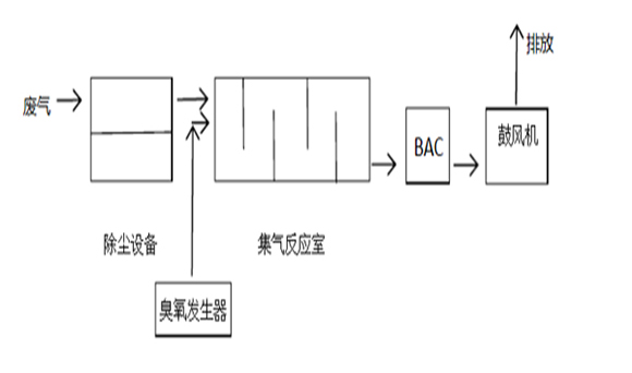 1、廢氣臭氣成分 廢氣是指人類在生產(chǎn)和生活過程中排出的有毒有害的氣體。特別是化工廠、鋼鐵廠、制藥廠,以及煉焦廠和煉油廠等,排放的廢氣氣味大,嚴重污染環(huán)境和影響人體健康。廢氣中含有污染物種類很多,其物理和化學性質非常復雜,毒性也不盡相同。燃料燃燒排出的廢氣中含有二氧化硫、氮氧化物(NOx)、碳氫化合物等;因工業(yè)生產(chǎn)所用原料和工藝不同,而排放各種不同的有害氣體和固體廢物,含有各種組分如重金屬、鹽類、放射性物質;汽車排放的尾氣含有鉛、苯和酚等碳氫化合物。廢氣污染大氣環(huán)境是世界最普遍最嚴重的環(huán)境問題之一。 惡臭其他按組成可分為5類: ①含硫化合物,如硫化氫、二氧化硫、硫醇、硫醚; ②含氮化合物,如胺、酰胺、吲哚等; ③鹵素及衍生物,如氯氣、鹵代烴; ④烴類,如烷烴、烯烴、炔烴、芳香烴; ⑤含氧有機化合物,如醇、酚、醛酮、有機酸等。 2、臭氧技術原理 臭氧除臭原理:臭氧的氧化能力極強,其氧化還原電位僅次于氟,在其應用中主要用這一特性能可快速分解產(chǎn)生臭味及其它氣味的物質,如胺、硫化氫、甲琉醇等,臭氧使其氧化分解,生成無毒無氣味的小分子物質。 依靠其強氧化性能可快速分解產(chǎn)生臭味及其它氣味的有機或無機物質,自然界引起臭味與腐 味的主要成分是胺R3N、硫化氫H2S,甲硫醇CH3SH等。臭氧對其氧化分解,生成物沒有氣味。臭氧可以與它們發(fā)生化學反應將其氧化分解為無毒、無臭的物質,從而達到除臭的效果。 反應式如下: R3N+O3→R3N-O+O2 H2O+O3→S+H2O+O2→SO2+H2O CH3SH+O3→[CH3-S-S-CH3]--→CH3-SO3H+O2 3、處理設計方案 ①、除塵設計 由于部分廢氣含有少量甚至大量粉塵顆粒,而臭氧的無選擇性反應在帶有粉塵的廢氣中的投加量過大(因為臭氧會同時和顆粒物反應),所以在臭氧廢氣臭氣處理中,首要步驟是除塵。旋風除塵器適用于凈化大于5~10微米的非粘性、非纖維的干燥粉塵;袋式除塵器很久以前就已廣泛應用于各個工業(yè)部門中,用以捕集非粘結非纖維性的工業(yè)粉塵和揮發(fā)物,捕獲粉塵微??蛇_0.1微米;電除塵器能夠鋪集0.01微米以上的細粒粉塵,等等。 ②、集氣反應室的設計 根據(jù)各大文獻及資料,臭氧除臭反應時間僅僅只需要5到8秒,這樣我們就能夠得到處理反應室的體積,即集氣反應室體積=廢氣氣量×反應時間(5到8秒,基本取值5秒)。為了使反應更加充分,氣室中設計隔板,隔板間距平分,使得氣流和壓力處于統(tǒng)一狀態(tài)。 ③、臭氧發(fā)生器進氣端設計 為了使反應充分徹底,臭氧進氣與廢氣進氣處于相鄰位置,最佳理想狀態(tài)是臭氧與廢氣相互,徹底反應。但是考慮到臭氧發(fā)生器出氣管道負壓的產(chǎn)生,臭氧進氣端方向應與廢氣方向相同。 ④、活性炭設計 當臭氧完全和廢氣發(fā)生反應,產(chǎn)生無二次污染物質,理想狀態(tài)是無臭氧殘留,但是由于臭氧添加量把握精確度不高,所以往往會在理論值的基礎上增大添加量,有可能在廢氣完全被處理后,還有臭氧殘留。所以在處理后的氣體出口在接入活性炭BAC,不僅能夠吸附殘留的臭氧,還可以進一步凈化廢氣,減小臭氧添加量。 ⑤、工藝流程示意圖