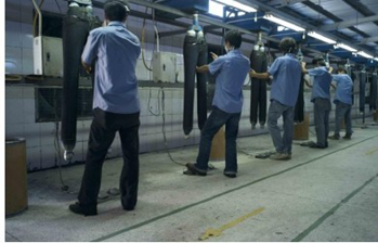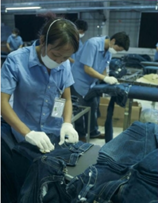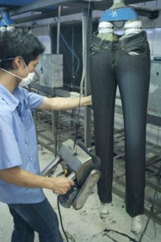 三:臭氧氧化與傳統(tǒng)方法的優(yōu)缺點(diǎn)比較 1. 用次氯酸鈉(婆梅度為18度)經(jīng)濟(jì);不好控制,有傷布的纖維。健康危害:經(jīng)常用手接觸本品的工人,手掌大量出汗,指甲變薄,毛發(fā)脫落。本品有致敏作用。本品放出的氯氣有可能引起中毒。具腐蝕性,可致人體灼傷,具致敏性。 2. 用亞氯酸鈉和硫酸在加次氯酸鈉。價(jià)格比上一種高點(diǎn)。但比上一種好點(diǎn)。不傷布的纖維。亞氯酸鈉有強(qiáng)氧化性。在175℃時(shí)即分解而發(fā)熱,與可燃物質(zhì)接觸,即起猛烈爆炸,須注意安全。硫酸對(duì)環(huán)境有危害,對(duì)水體和土壤可造成酸性污染。具強(qiáng)腐蝕性、強(qiáng)刺激性,可致人體灼傷。 3. 高錳酸鉀、過(guò)醋酸和還原漂白方式 關(guān)于牛仔布漂白,除了用次氯酸鈉和亞氯酸鈉外,還可以用高錳酸鉀、過(guò)醋酸和還原漂白方式,具體需要根據(jù)牛仔布所用染料類(lèi)型來(lái)選擇,傳統(tǒng)牛仔為還原淀籃染料,也有用硫化染料或直接染料代替,也有采用活性染料代替的,故此,需要根據(jù)具體情況考慮。 4. 臭氧氧化的優(yōu)點(diǎn) a) 無(wú)污染,臭氧為純凈物。在常溫下,易分解,生成氧氣和氧原子 b) 臭氧的氧化能力極強(qiáng)。 c) 運(yùn)行成本低 四:手工處理 1.手擦 a) 在洗水前,通過(guò)使用砂輪滾動(dòng)摩擦而使布面染料褪色,手擦的地方通常是脾位和臀位,人為的機(jī)械褪色,讓牛褲在洗水后顯得自然地懷舊和泛白 b) 噴沙和手擦效果接近,但對(duì)布紋的效果有差別。噴沙后布紋模糊,沉底,而手擦后布紋清晰凸顯