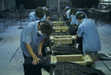 3.磨邊 磨爛 勾紗 將衣物在洗水前,人為地將褲腳,褲頭等一些特定部位用銳器刮爛,從而制成洗后的破爛懷舊效果 4.打搶.手針 用線(xiàn)將牛褲某些部位縫起,凸出的部位由于在洗水過(guò)程中受的的摩擦較多,從而掉色較嚴(yán)重,水洗效果也較明顯,而凹入的部位在洗水過(guò)程中受的的摩擦較少,從而掉色較輕,水洗效果不明顯。同沒(méi)做手針的其它部位形成深中淺的三種洗水效果 5.立體貓須 將衣物浸免燙樹(shù)脂并脫水后,在特定部位用夾子夾出需要的形狀,起伏度,然后再高溫烘焙,讓樹(shù)脂交聯(lián)定型,從而制出永久的立體褶皺效果 6.噴砂 是在洗水前,通過(guò)使用一些表面粗糙的物質(zhì)(如硼砂),通過(guò)噴槍在一定的氣壓作用下使沙打擊并摩擦布面而達(dá)到褪色的效果,噴砂的地方經(jīng)洗水后顯得較為自然地懷舊和泛白,給人較強(qiáng)隨意感 7.扎花 扎洗是在洗水的過(guò)程中將衣物以繩子等東西全部或局部扎起來(lái)后洗水,以達(dá)到洗后布面呈現(xiàn)隨意的深淺色對(duì)比,有浮云般的效果(類(lèi)似扎染 8.馬騮 噴一些氧化劑,一般是高錳酸鉀溶液,讓衣物局部褪色,從而讓牛褲顯得自然地懷舊和泛白 9.噴色 抹色 將衣物在洗水后,用人手將涂料或者直接料涂抹或者噴灑在衣物表面,制作懷舊效果